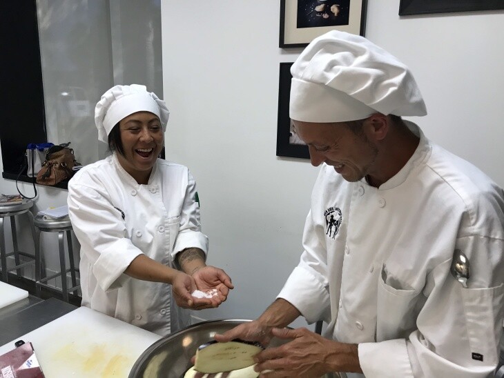 Bay and Bobby take their place among eight other students around a large prep table at The Hood Kitchen Space in Costa Mesa. They all wear white coats and chef hats.