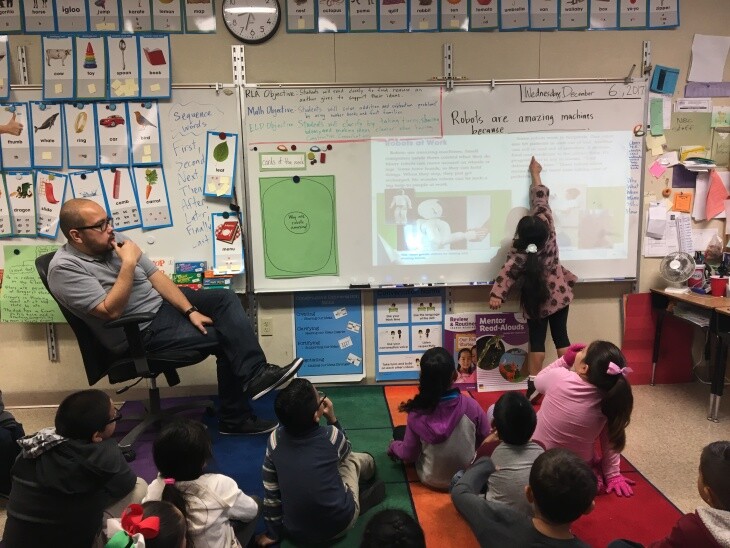 Ramirez points to the opening line of a non-fiction passage called "Robots At Work," projected onto his classroom's white board.
