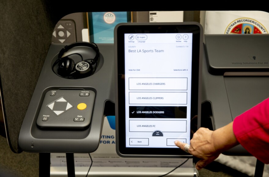 Electronic ballot marking devices developed by Los Angeles County will be the default option in all 1,000 new vote centers, replacing the familiar old InkaVote System. The new devices include touch screens to mark voter selections, which are then printed onto a paper ballot that will be collected and tallied by election officials.