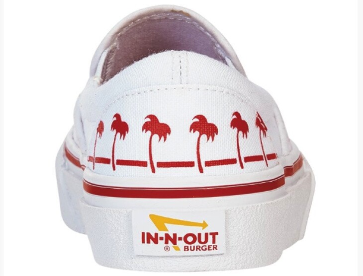 Translation: They look like a pair of white Vans slip-ons with a bunch of red squiggles and palm trees on the front, a red ring near the base and the In-N-Out logo at the heel. And yes, we would wear them. In fact, we will definitely need a pair to test, strictly for research purposes, of course.