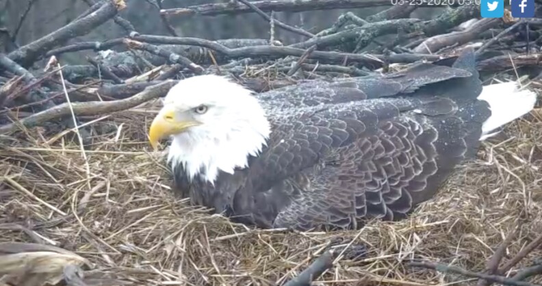 Although the Big Bear Valley Bald Eagle Cam is still online, Jackie and Shadow (the eagles) lost their eggs recently to a few ravens, and haven't returned to their nest. However, we found a great camera from Hanover, Penn., with an eagle sitting in the nest every time we visited. (We're not sure if the one sitting in the freezing rain in the above screengrab is Liberty or Freedom.)