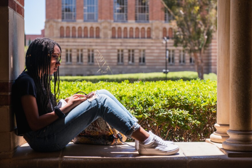 Kyla Monette sits at Royce Hall on the UCLA campus before the COVID-19 crisis. (Andrew Cullen for LAist)
