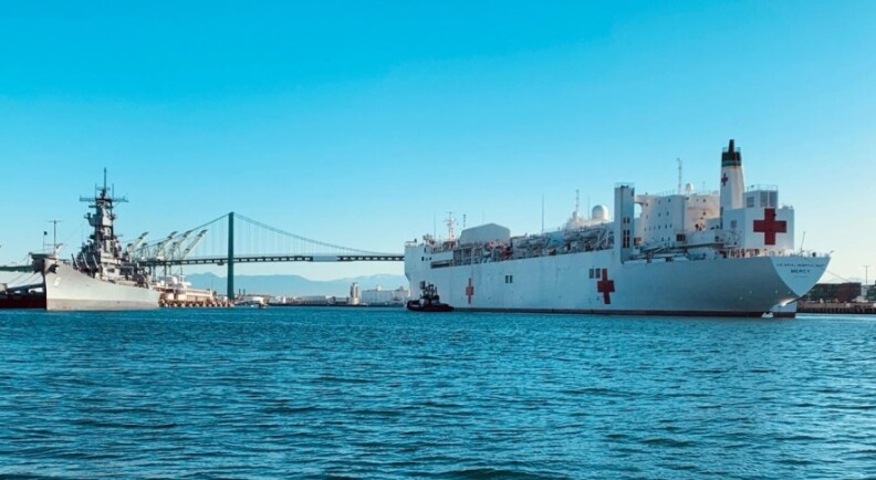 The Battleship IOWA (left) assisted in operations of the USNS Mercy during the pandemic's safer-at-home period. Now it's back and open for tours. (Courtesy of the Port of Los Angeles)