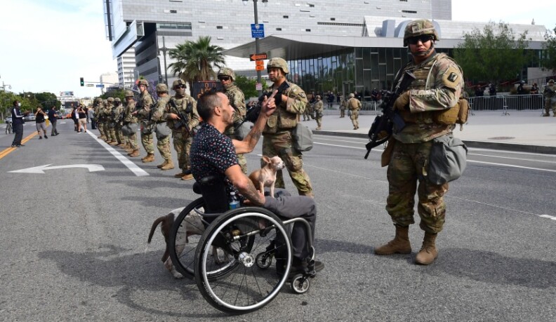 In downtown Los Angeles, National Guard vehicles rolled through the streets as peaceful demonstrators walked and chanted and were occasionally corralled by police. The protestors were mostly in the Historic Core, around 5th at Main and Spring streets. This evening, police began arresting protestors who wouldn't disperse and brought in buses from the Sheriff's Department to haul away the detainees