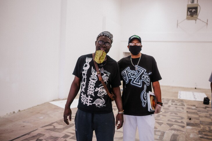 Aziz Diagme (L) and Roscoe Lee Owens (R) in Leimert Park. (Chava Sanchez/ LAist)