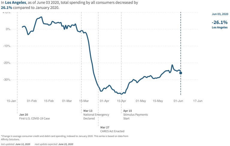 - Downturns in the L.A. area have been steeper. Spending here was down 26.1% as of June 3. Lows reached near 37% in late March.