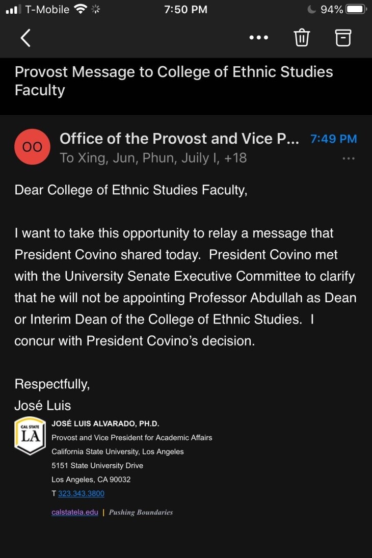 On Friday, Abdullah shared a message sent by the university's provost to the Cal State ethnic studies faculty on Thursday night saying she will not be considered for either dean or interim dean.