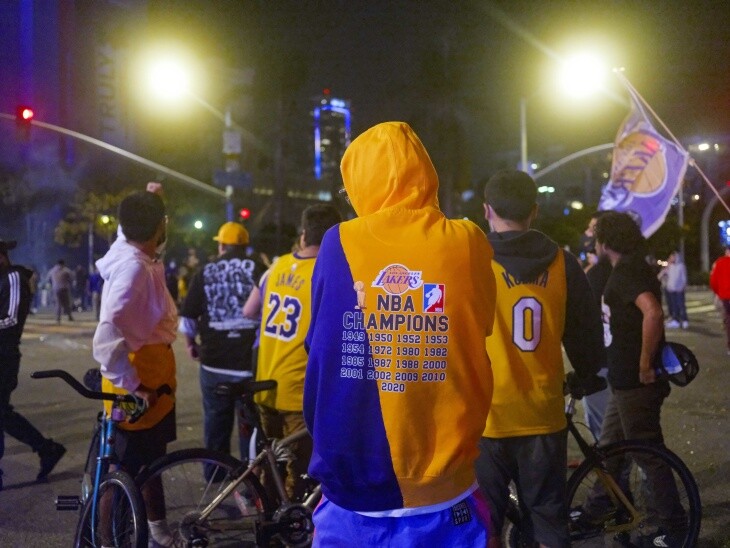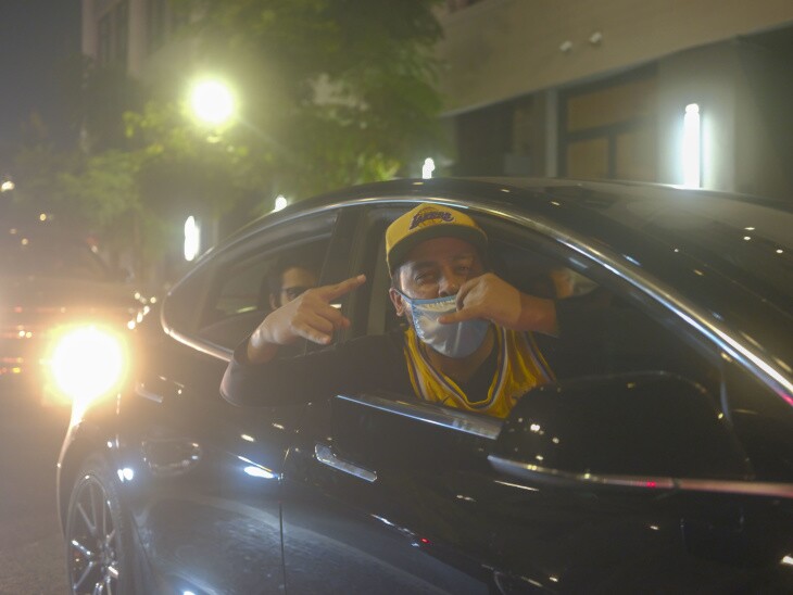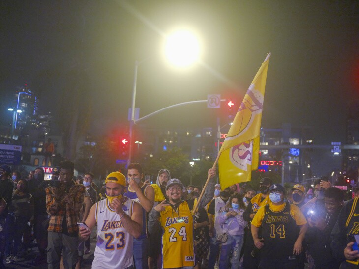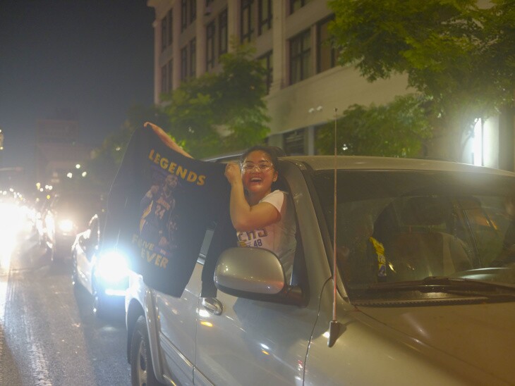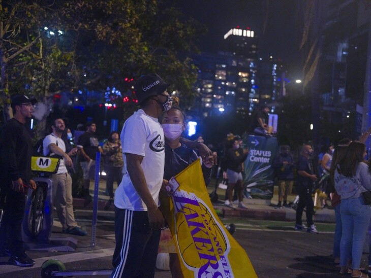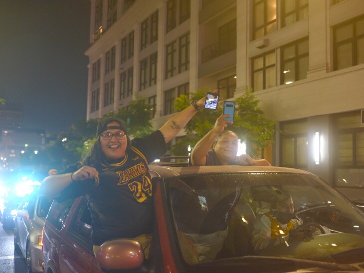 Despite the city urging people to demonstrate joy at home, Lakers fans took to the streets around Staples Center to celebrate the win. Fireworks lit up the skies. People stuck in traffic jams passed the time by hanging out of car windows cheering, chanting, waving flags, and twirling jerseys. And throughout the night, Kobe Bryant's name echoed in the air like a prayer.