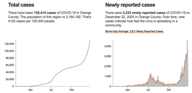Orange County reported more than 4.400 new coronavirus cases Wednesday and 2 deaths. The county reported its highest ever daily case count -- 4,606 -- this past Sunday.