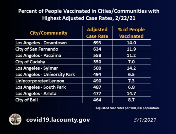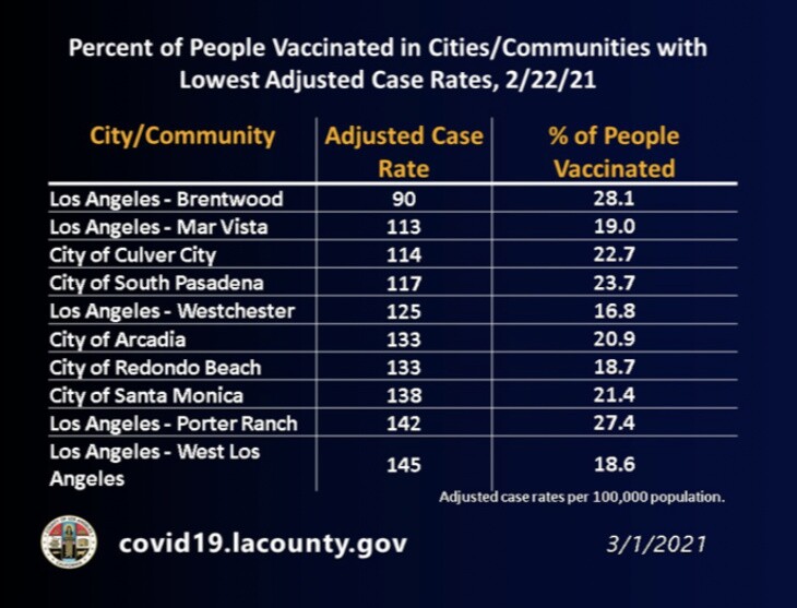 L.A. County has administered nearly 2 million vaccine doses so far and more than 600,000 of them are second doses. About 6% of the county's adult population is now fully vaccinated although data shows that residents of affluent areas are getting vaccinated at higher rates.
