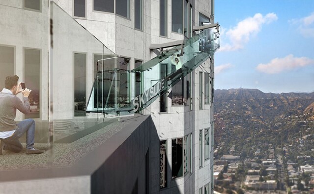 To remedy the dullness of tired, conventional glass-bottomed sky decks, the owners of the US Bank Tower are building a "Skyslide," according to Curbed LA. Dropping from the 70th to the 69th floor of the West Coast's tallest building, the Skyslide will let thrill seekers slip along a 36-foot-long glass-bottomed slide more than 1,000 off the ground. Hopefully this actually happens, unlike the dud that was supposed to be downtown's giant slip-n-slide.