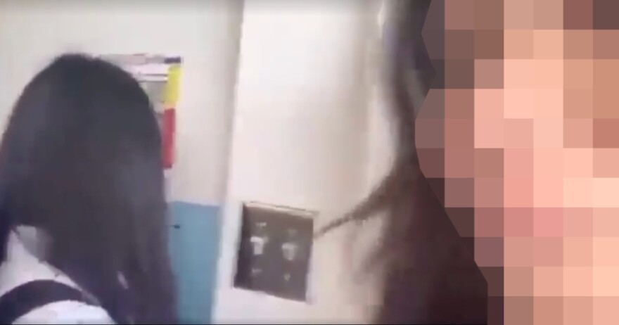 In another video shot the same day, one of the girls roughly touched the face of a masked Asian American female student who, seemingly stunned, mumbled, "No, thank you."