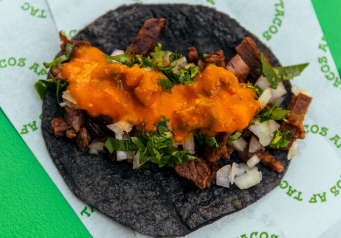 - Tacos AF in downtown L.A.’s Jewelry District is now offering a “Spooky AF” Halloween taco for $3 through Oct. 30 (closed on Sundays). Made with black stone-ground handmade tortillas from LA Chapalita, guests can choose from carne asada, al pastor, chipotle marinated chicken or vegan-friendly mushrooms, which are then topped with the house-made (bright) orange habanero salsa.