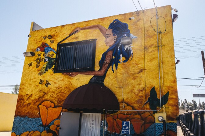 From there, if you were to hop on the Gold Line to Union Station, transfer to the Red Line to North Hollywood, switch to the #224 bus and get off at the corner of San Fernando Road and Van Nuys Boulevard, you'd find yourself on a stretch of Pacoima where auto body shops, hair salons, restaurants and insurance offices serve as large-scale canvases. Known as Mural Mile, the stretch boasts more than 30 works, approximately a third of which were created by Pacoima native Kristy Sandoval.