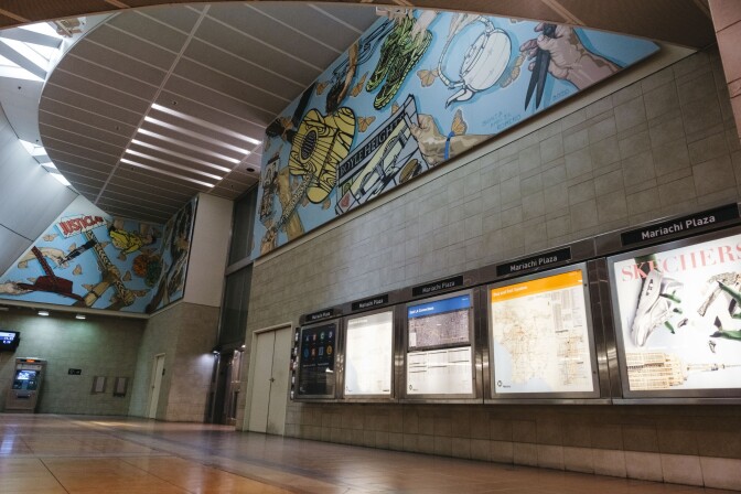 On the mezzanine level inside the Mariachi Plaza Metro Station in Boyle Heights, you can't help but notice the northwest wall and its collection of brightly painted objects -- a fedora, a feather, a violin, a sombrero, a protest sign, monarch butterflies. It's Sonia Romero's latest mural, "Hecho a Mano," a work that interweaves three generations of family lore with the neighborhood's diverse history.