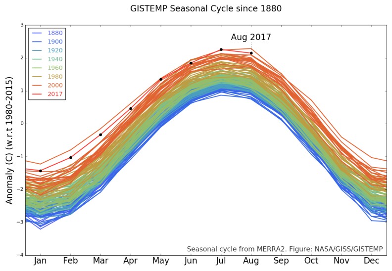 On Monday, NASA announced that August 2017 was the second hottest August the planet had seen since the advent of modern record-keeping. It was surpassed only by August 2016—2016 was also the overall hottest year on record.