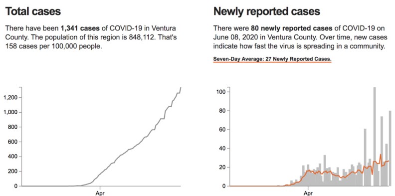 - Ventura County reported 40 new cases, bringing the total there to 1,381. The county has had 35 deaths.