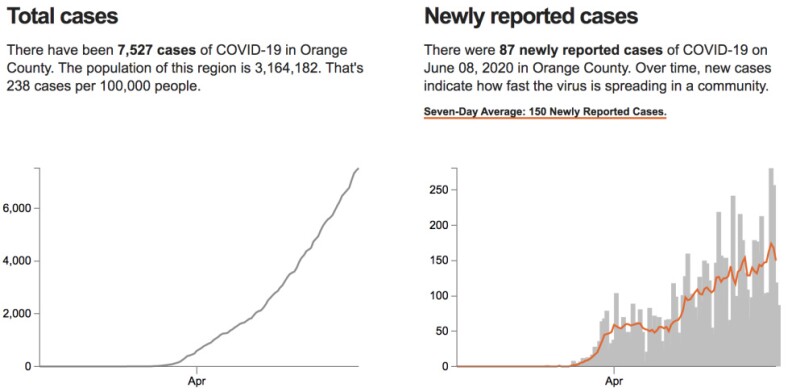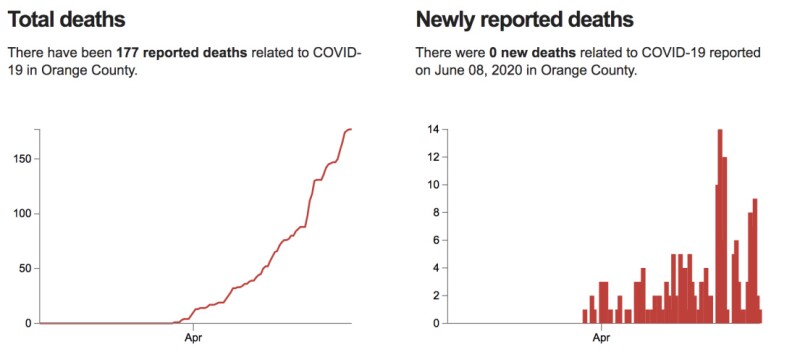- Orange County reported 93 new cases today, bringing the total in the county to more than 7,600. County officials also reported 8 new deaths, bringing that total to 185.