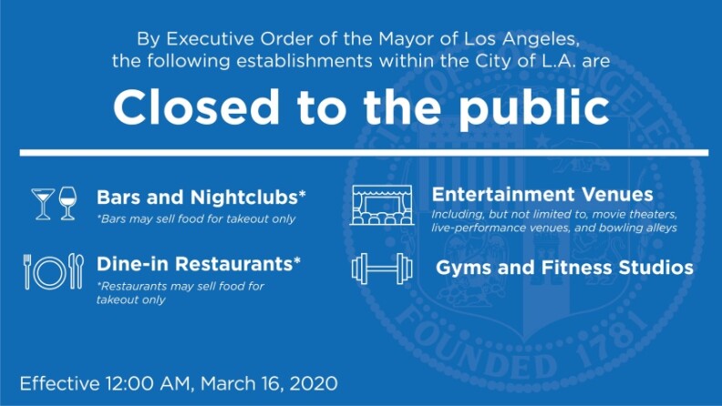 On March 15, L.A. County officials said they were closing all offices to the public, Los Angeles Mayor Eric Garcetti issued a moratorium on evictions, and an executive order banning dine-in restaurants and entertainment facilities went into effect at midnight.