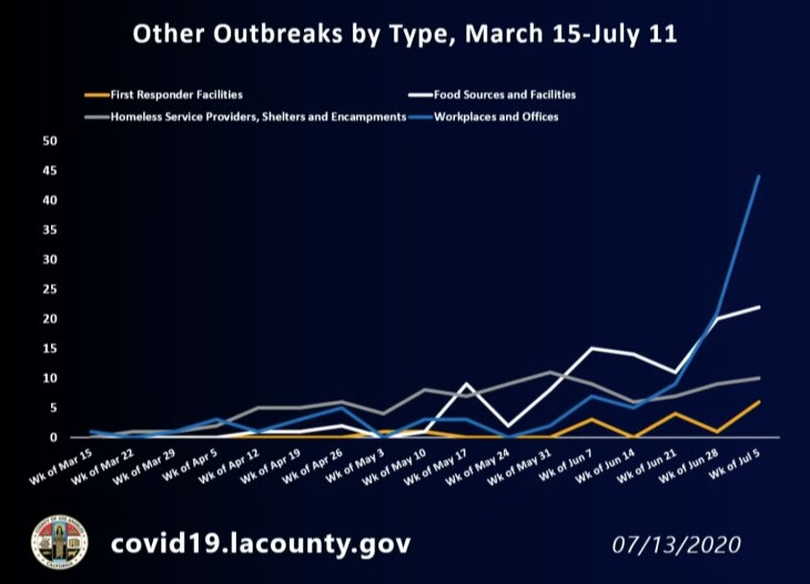 Ferrer shared the county's latest data, which showed that the sharpest increase in recent outbreaks of COVID-19 are happening at workplaces and offices, including warehouses, manufacturing and retail businesses.