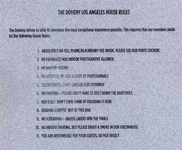 How tight is secrecy about the Doheny? Recently Citysearch described it thusly:, "Downtown club king Cedd Moses' new lounge is so exclusive he won't even reveal the address." Although neither Moses or Demarest mentioned the exact address, the cost of membership was finally announced, as were the hilarious House Rules, and how much you should be earning if you wanna be taken seriously.