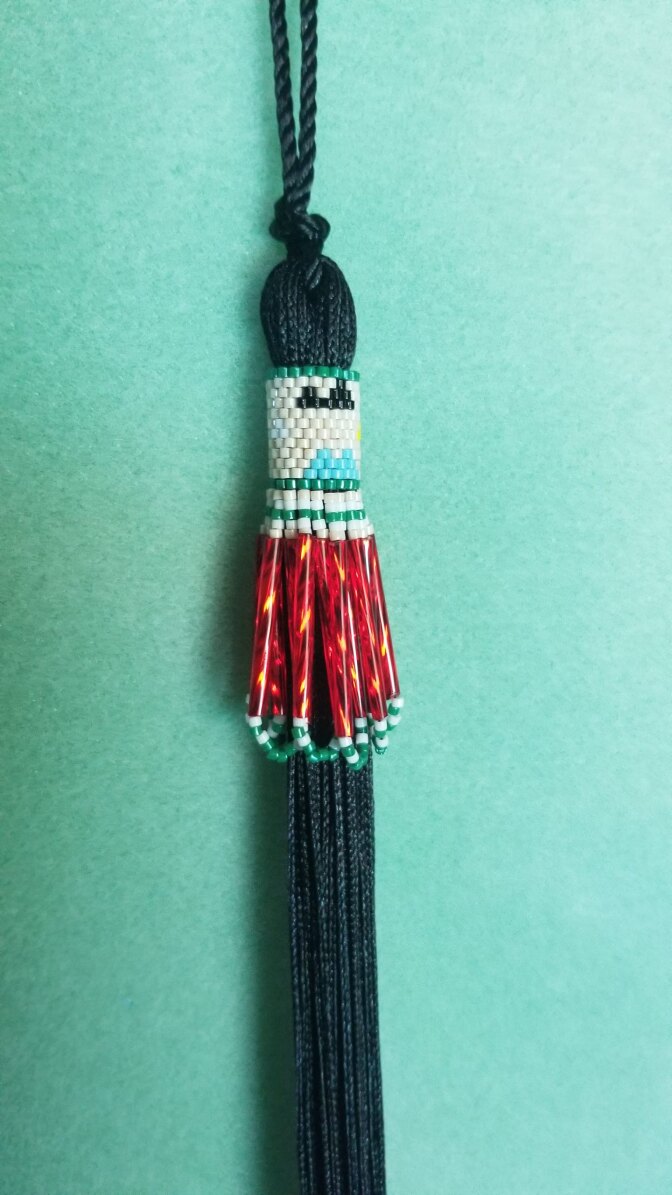 So her cousin, who’s a graphic designer, made the brochure. Yellowhair made a beaded tassel cover for another member of the association who’s graduating.