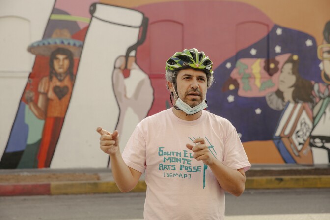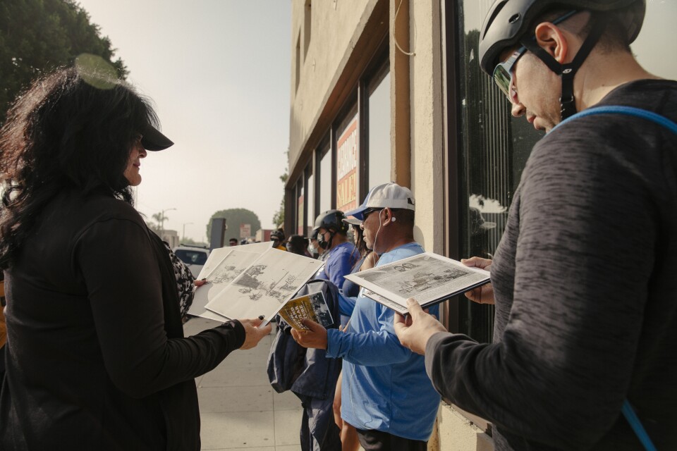 During the rides, Guzmán and his colleagues give site-specific mini-lessons, including tear-proof copies of primary sources. At the first bike ride earlier this month, writer Carribean Fragoza had cyclists pause before a mural titled “She Brought Her People With Her,” part of the collective’s work to resurrect El Monte’s mural movement.