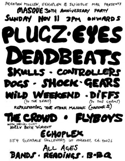 For those of you who remember the Masque (and those of you wishing you remembered the Masque), Brendan Mullen, The Echo and Swindle Magazine will be presenting Punk Veteran's Day 2007 Sunday at the Echo. Come celebrate the release of Live at the Masque: Nightmare in Punk Alley, a book of previously unreleased photos, posters and flyers compiled and edited by Brendan Mullen and Roger Gastman.