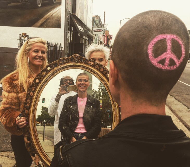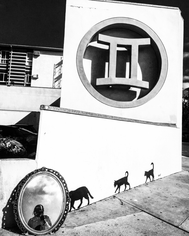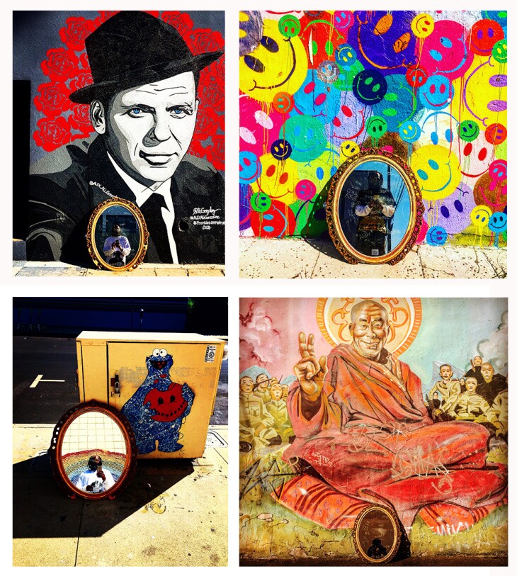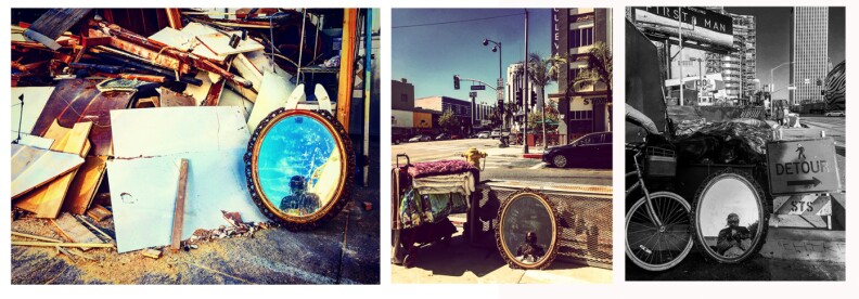 On Beverly Blvd. there's a cafe called Insomnia. It used to be open 24 hours. Eventually, they only stayed open until 2 a.m. and by the time I started going there, it was only open until midnight. It has been here for about 30 years. In the bathroom, graffiti was actually encouraged, including on the mirror. I heard that Banksy himself had scrawled something into the mirror, which was possible because he had done a few works a few blocks away. I found out it had been sold and remodeled, when I was walking behind the alley and saw all the debris piled up. Including the mirror. I took some photos then decided to put it on my shopping cart and use it to take some more photos elsewhere. I figured I'd have it for a couple of days. Instead, I had it on my cart for another year. I called it the #insomniamirrorseries.