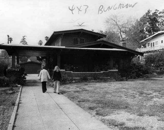 "This early 20th century Craftsman bungalow in a middle income neighborhood in Pasadena on February 16, 1976, is noted for its brick-and-wooden porch and pagoda-style roof. "(Photo courtesy of the Los Angeles Public Library Photo Collection)