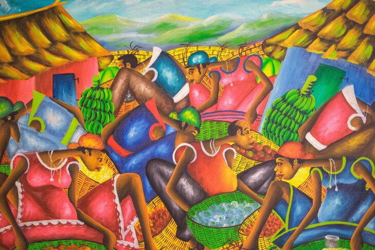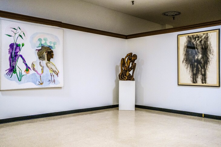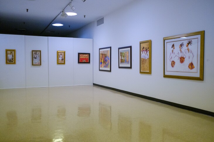 The granddaughter starts a tentative walk around the museum's polished, softly lit antechamber. She takes in acrylics of ebony female figures — doctors, ballerinas, aviators — in dreamlike friezes, melding with collages of found text. This is just the gallery for rotating exhibitions. Beyond the gift shop filled with African figurines, quilts, daishikis, drums and jewelry, a hallway leads past a small research library into a 5,000-square-foot event space displaying more than 40 holdings from the permanent collection. They include paintings from local luminaries Suzanne Jackson and Charles White mixed with lesser-known artists such as Mississippian William Tolliver and Haitian Gesner Abelard. The only aural accompaniment is the soft rumble of the ventilation system.