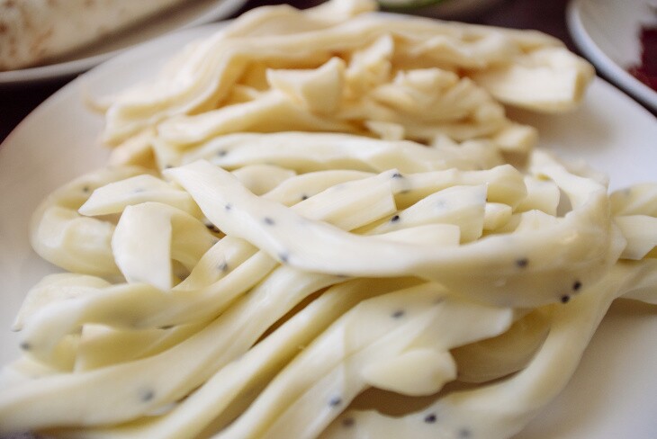 Lori cheese, which is less famous in the U.S., is a pale, yellow cheese named for the Armenian province where it originates. It may look like havarti but it tastes much different. Lori cheese has a light saltiness that kicks in after your first bite. You can nibble on it plain but it also pairs well with lavash and fresh herbs such as parsley or dill. It's not as ubiquitous as string cheese, but Lori cheese is worth seeking out. You probably won't find it pre-packaged in the dairy section. Whether you're at a large store, like Super King, or a small shop, like Hye Market, look for it at the deli counter.