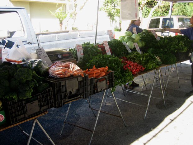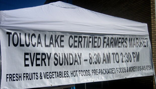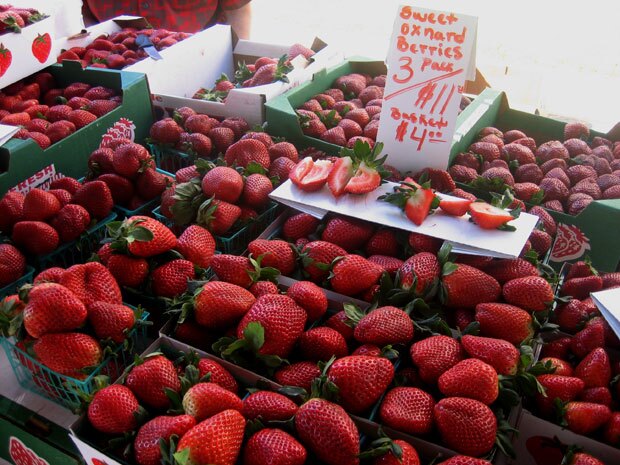 It's certainly not the biggest farmer's market around--in fact it's pretty close to fledgling. Operational since last fall, the Toluca Lake Certified Farmer's Markettakes over just one tiny block on Sancola, north of Riverside Drive. There are a few produce stands featuring excellent, although somewhat limited, selections of fresh local fruits and veggies, as well as at least one floral stand, craftsmakers with wares from soy candles to jewelry, tamales, baked goods, and a live band. The produce vendors are eager to offer up samples of their wares; today we bit into three different kinds of strawberries all hailing from Oxnard, and nabbed a modest basket to take home for ourselves. What we like best about this market, in addition to it being more handy to our home and less chaotic than the more established Studio City Farmer's Market, is that by stopping by we're doing our own small part to support local growers and culinary artisans, and getting to chat with the vendors about their endeavors. A great review ran awhile back by the Vegetarians in Paradise (although we admit we favor the piece because it makes mention of someone oh-so-near-and-dear to this LAist's heart) and we thought we'd finally get around to getting some pics up to spread the word about this little farmer's market that could. Or does. Or... you get the idea. Now get the pictures--after the jump.