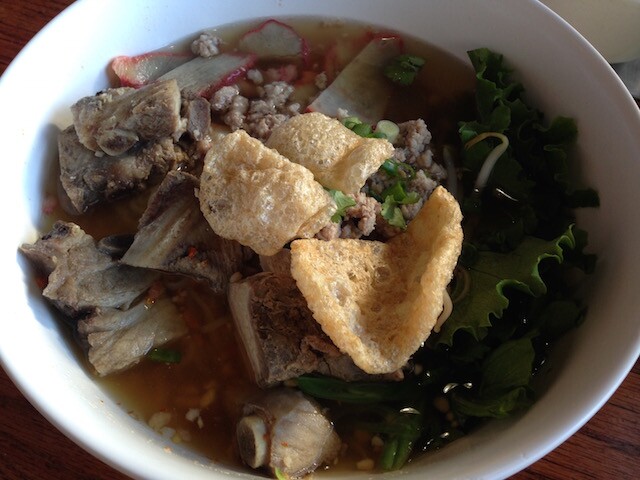 Hoy Ka's spare rib tom yum noodles topped with chicharrones (Photo by Jean Trinh/LAist)