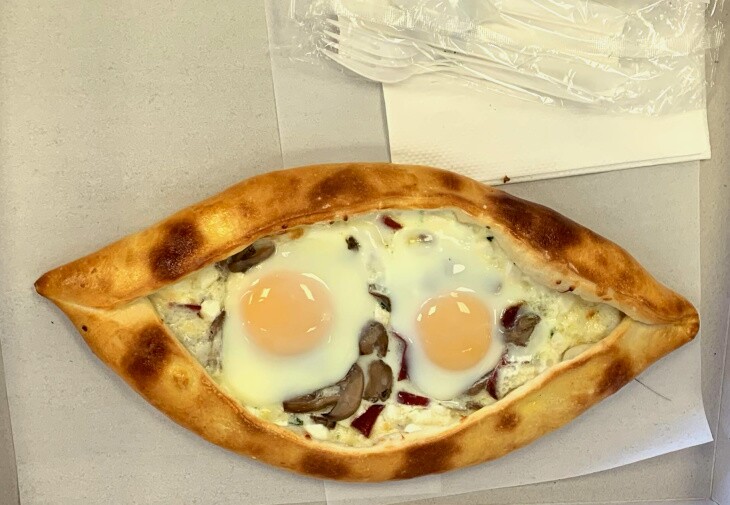Ajarski, ajarian, ajaruli, adjarakah, hachapuri, egg boats, egg pizza, gondola pizza. Khachapuri has many aliases. It depends on who you ask and what the sign next to the football-shaped bread icon reads.