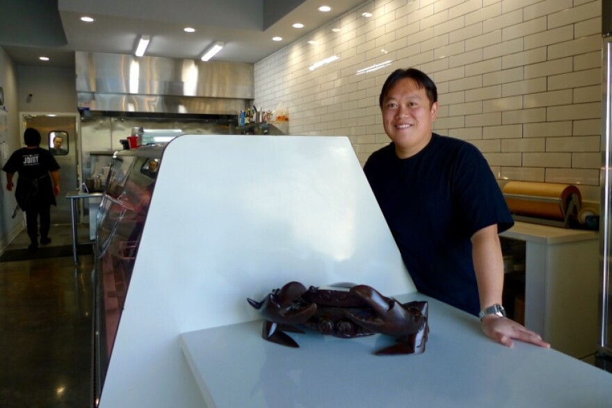 Unlike many fish markets and restaurants, which order from a list of available fish, Liao handpicks every fish sold at The Joint. Because he brings in almost everything whole, rather than as filets, he also has to figure out how to use cuts that are hard to sell. After slicing the filets, he scrapes the soft meat left on albacore bones and uses it to make tartare. Liao will serve a seafood roll every day but he can't promise it'll be a lobster roll. It might be made with wild shrimp from Baja or Box Crab caught in Santa Barbara. Since Crabs reproduce quickly, they're one of the most sustainable seafood options.