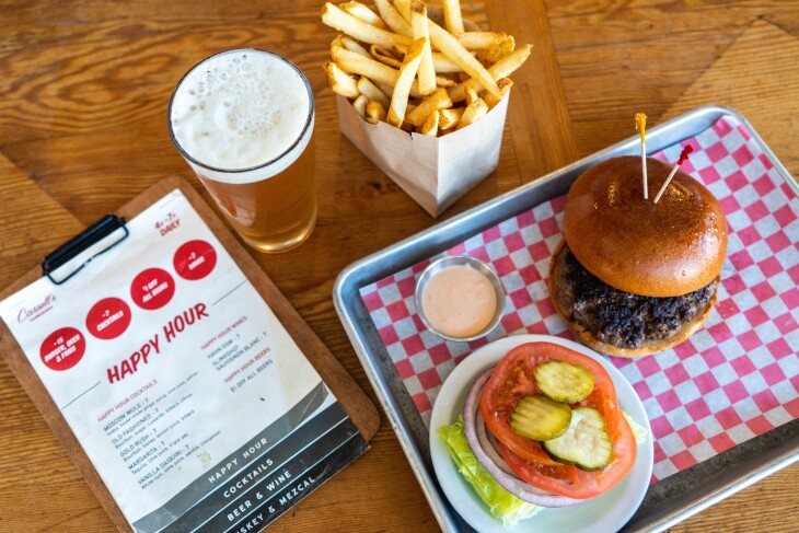O. Since the restaurant is usually buzzing as soon as it opens at 6 p.m. (on weekdays) through dinner time, Here's Looking At You offers its food and drink specials after 8:30 p.m., when things usually quiet down. Sure, it's late but the deal, which is more dinner than bar bites, is irresistible. (Cocktails are usually $16-$17 and menu items are $15-$19.) You can pick from a handful of dishes including a gem salad, beef tartare or bone marrow but we recommend the burger. This is the only time (and way) it is served: a double cheeseburger of two dry-aged beef patties, two slices of white American cheese and housemade Thousand Island dressing on a potato roll. The three cocktail offerings may change but currently there's an Old Fashioned variation, a sour and something sparkly.