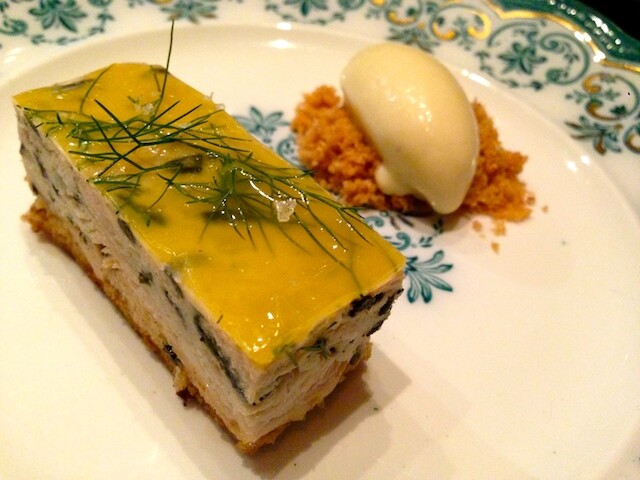 Chicken terrine with pain perdu and mustard quenelle at Maude (Photo by Krista Simmons/LAist)