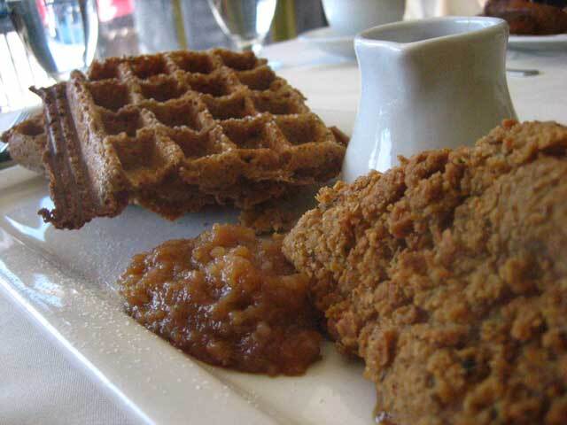 For brunch, the restaurant is at its liveliest. Families and friends in groups of four to eight seem to dominate the reservations list with couples scattered about and a few singles enjoying their meal at the small bar. As you wait, you see food delivered to other tables and you begin to salivate as your curiosity focuses on "what the hell will this fake chicken and waffles be like?"