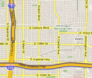While Downtown, Santa Monica and LA between the Santa Mountains and the 10 Freeway are fairly well represented in coverage, The Valley and South LA are lacking. In the Valley, Street View only travels Ventura Blvd. as far West as Balboa in Encino and no further than Magnolia Blvd to the north (other than two streets that stretch to Sherman Way). South LA's representation mainly consists of freeways (pictured to the below right is the intersection of the 110 and 105 freeways near the neighborhoods of Watts, Magnolia Square, Green Meadows, Vermont Vista, Century Palms and Century Cove).
