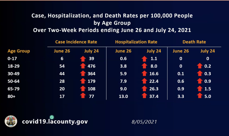 “While rates are relatively low across the board, all [pediatric] age groups experienced five- to six-fold increases in case rates between the end of June and the beginning of July,” said county health director Barbara Ferrer at her weekly press conference on Thursday.
