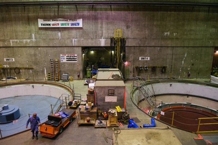 Below you can see two of the six turbine units. Unit 3 on the left, is covered and is ready to produce electricity as water spins the turbines inside it. Unit 4, on the right, is open for maintenance.