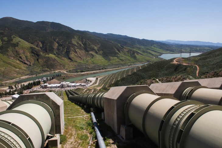 Once you're inside the gates, the first thing you notice are six gargantuan pipes that flow water from Pyramid Lake 7.5 miles down to Castaic Lake. Water is pumped back uphill in the same 30-foot-diameter pipes.