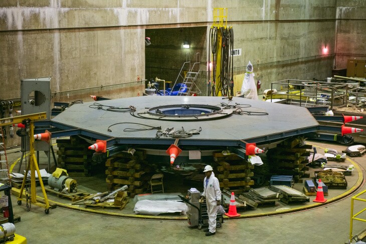 Time to head down into the guts of the plant. We step off the elevator to a balcony overlooking a giant windowless chamber four stories tall.