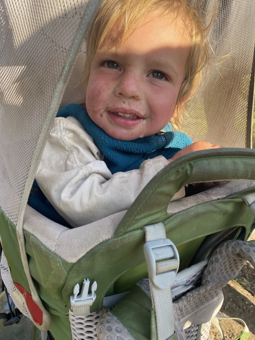 I ask Sequoia whether she misses school. She says she misses drawing. She also misses her stuffed dog, Bingo. But Sequoia seems delighted by the toys she's picked up, and then discarded, along the trail — Susanna the rattlesnake, a car with the back wheels missing, a scraggly baby doll that she carries in the outside pocket of her backpack.