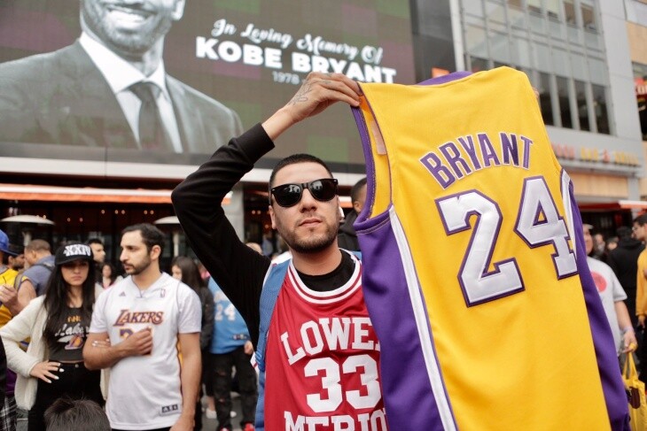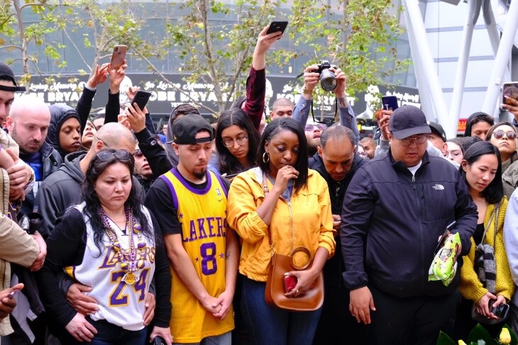 "Can't believe this is happening," said Petey Reina, a Lakers fan who showed up to L.A. Live with a big, framed portrait of Bryant. "It's a sad day for basketball and the world."