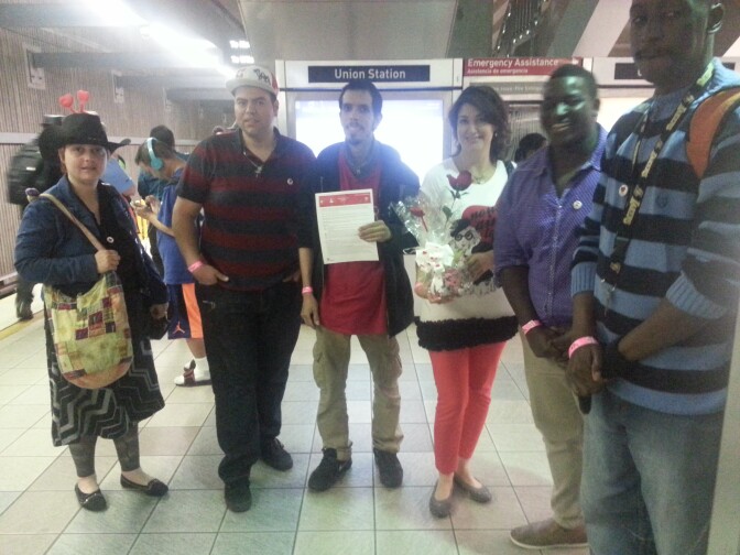 Metro officials dressed up in festive Valentine's-themed attire before handing out wristbands and instructions for those participating in the love match on the Red Line.
