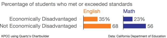 But even with the gains, just over half of students still failed to clear the state's bar on the English tests. More than 60 percent nearly met or did not meet math standards. And big achievement gaps persist: white and Asian students still far meet standards at a much higher rate than their black and Hispanic peers, and low-income students and English learners are still far behind more affluent and native English speaking students.