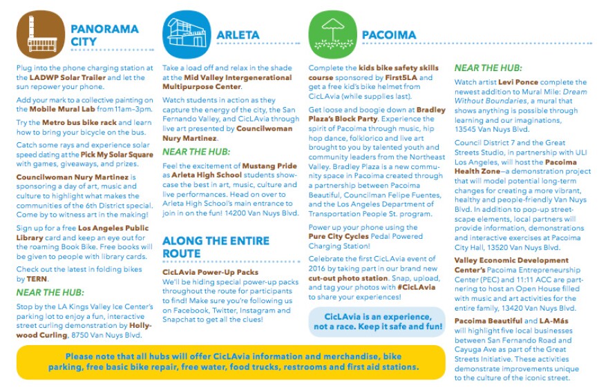 SoCal's favorite car-free event returns to the San Fernando Valley on Sunday. CicLAvia first hit the area last year with a 6-mile route along Ventura and Lankershim boulevards. This time, the route will stretch along a 4-mile section of Van Nuys Boulevard that runs through Pacoima, Arleta, North Hills East and Panorama City.