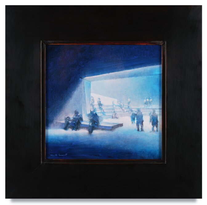 Like a huge butcher’s mallet, a slab of silvery architecture seems poised to crush a multilevel aggregation of urban commuters, cowering in a bluish, semi-dark tunnel. This painting, “Strata,” shows a rare intersection between the two principle worlds of painter Mark Innerst, who is showing 28 new works at the Kohn Gallery in Los Angeles.